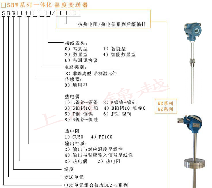 帶熱電偶(阻)溫度變送器選型表示示意圖